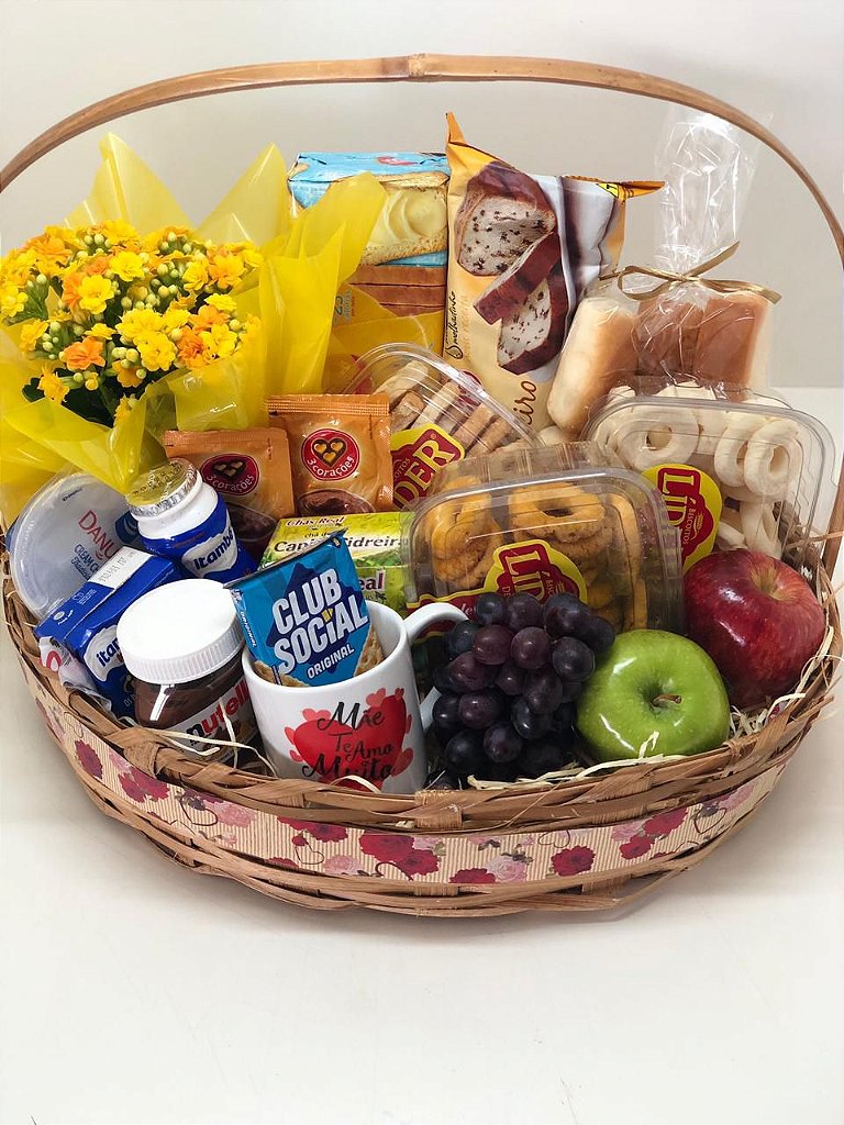 Itens da Cesta: 1 Flor Kalanchoe / 1 Torrada / 1 Bolo / 1 Nutella / Pães / 3 Caixinhas de Biscoito / 1 Maça / 1 Maça Verde / 1 Uva / 1 Iogurte / 1 Achocolatado / 1 Requeijão / 2 Café Solúvel/ 1 Club Social / 1 Chá