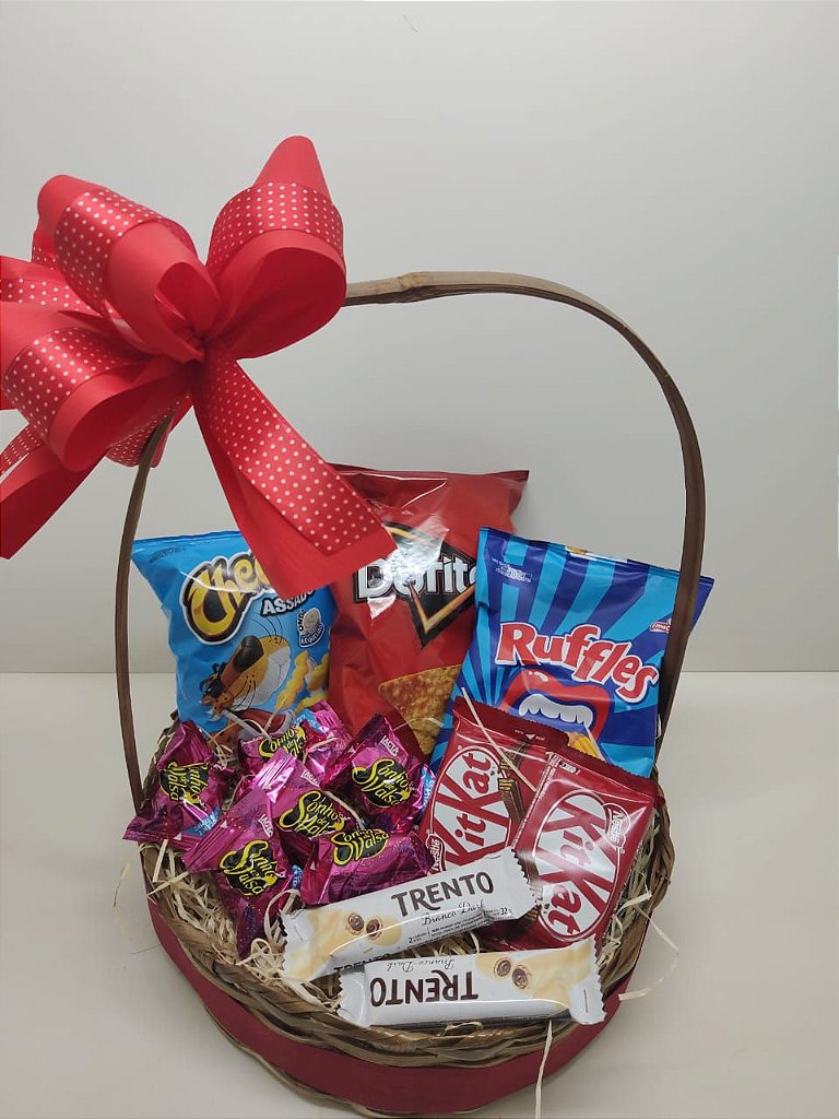 Itens da Cesta: 3 Tipos de Salgadinho, 2 Kit Kat, 2 Trento, 5 Sonho de Valsa